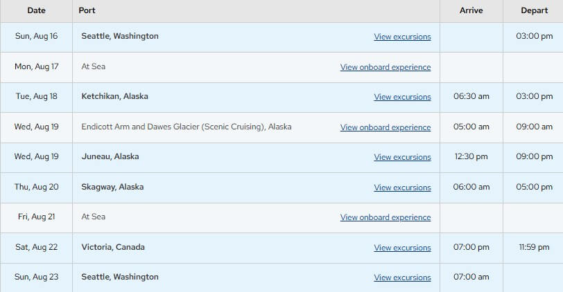 Itinerer krstarenja: Seattle (Washington) - Ketchikan (Aljaska) - Endicott Arm and Dawes Glacier (Scenic Cruising) - Juneau (Aljaska) - Skagway (Aljaska) - Victoria (Kanada) - Seattle (Washington)