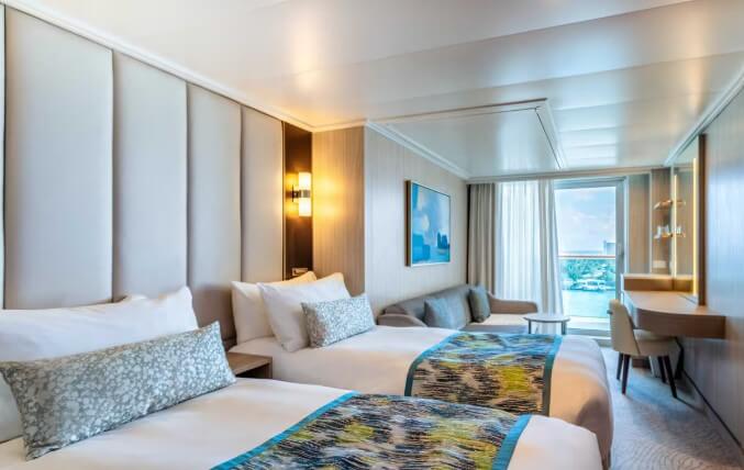Kabina s balkonom: U prvom redu za nezaboravne prizore. Ova elegantna kabina pruža dodatni luksuz - privatni balkon s udobnim vanjskim namještajem i opuštajućim pogledom na krajolik koji vas okružuje, bilo da se radi o zalasku sunca nad oceanom u svim bojama duge ili o novom gradu koji tek čeka da ga otkrijete. Idealna je za jutarnju kavu, doručak na otvorenom ili koktele prije večere. Približno 22 m² (uključujući balkon), bračni krevet ili dva odvojena kreveta, privatni balkon s 2 stolice i stolićem, staklena klizna vrata od poda do stropa, radni stol sa stolicom, privatna kupaonica s tušem, sušilo za kosu i kupaonski pribor, posteljina od 100% pamuka visoke kvalitete, hladnjak, TV ravnog ekrana, prostrani ormar, digitalni sef