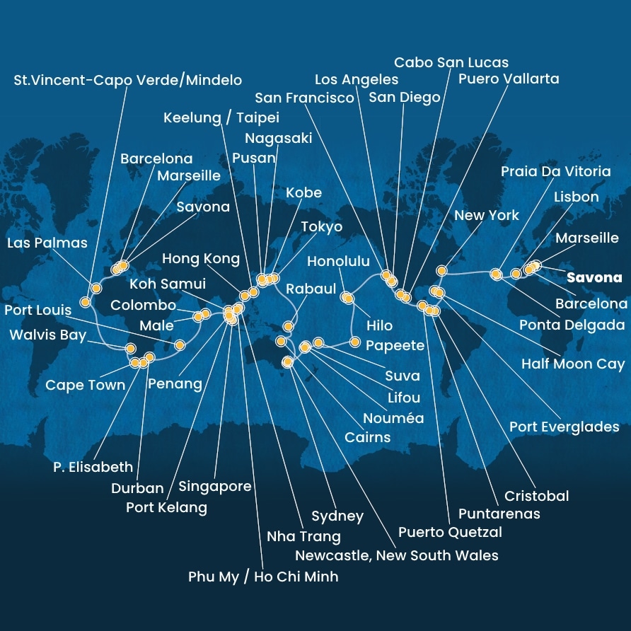 Krstarenje oko svijeta 138 dana. Ukrcaj Savona| Plovidba: Italija, Francuska, Španjolska, Maroko, Kanarski otoci, Antili, Kolumbija, Kostarika, Panama, Čile, Polinezija, Australija, Japan, Indija, Grčka